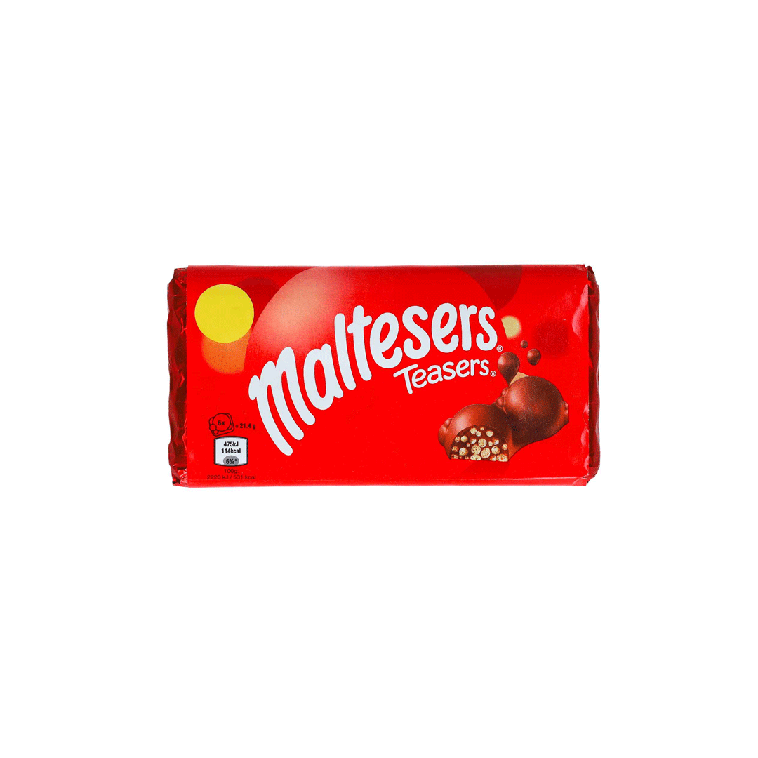 شکلات مالتیزر تیزرز (Maltesers Teasers) شاهکاری دیگر از کمپانی پرآوازه مارس (Mars) است که تجربه خوردن توپکهای مشهور مالتیزر را در قالب یک تابلت تختهای بازسازی کرده است. این شکلات از بهترین نوع شکلات شیری نرم و باکیفیت تهیه شده که در سراسر بافت خود، قطعات کوچک، بسیار ترد و عسلی مالت (Malt) را جای داده است. تضاد بین نرمی شکلات شیری و تردی بینظیر ذرات مالت، این محصول را به یکی از اعتیادآورترین و محبوبترین شکلاتهای جهان تبدیل کرده است.